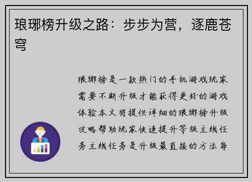 《琅琊榜》是一款热门的手机游戏,玩家需要不断升级才能获得更好的游戏体验。本文将提供详细的琅琊榜升级攻略,帮助玩家快速提升等级。